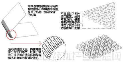 蘋果在美國(guó)申請(qǐng)的專利(美國(guó)專利申請(qǐng)?zhí)?0130216740號(hào))顯示,其基本構(gòu)造之一如上面最左邊的圖片所示。通過(guò)在希望板狀材料彎曲的地方切割無(wú)數(shù)的切口,可以使板具備彈性。這種構(gòu)造叫做活動(dòng)鉸鏈,在木工等領(lǐng)域?qū)儆诒容^常見(jiàn)的加工方法。