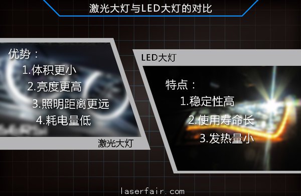 LED大燈憑借使用壽命長,節(jié)能的特點,正被多數(shù)廠商運用于旗下車型中。隨著激光大燈技術(shù)的興起,其在多方面表現(xiàn)均超越LED大燈。激光大燈相比LED大燈的優(yōu)勢在于,其占空間將更小,這點有利于車輛前部設(shè)計;另外更重要的是,激光大燈的照明效率提升70%(LED照明的光輸出約為100流明/瓦,激光照明則約為170流明/瓦),一般LED前燈大約耗電50瓦,而激光大燈可以將電能使用控制在30瓦以內(nèi)。另外激光大燈亮度是LED等的三倍,照明距離也將達(dá)到對方的兩倍。