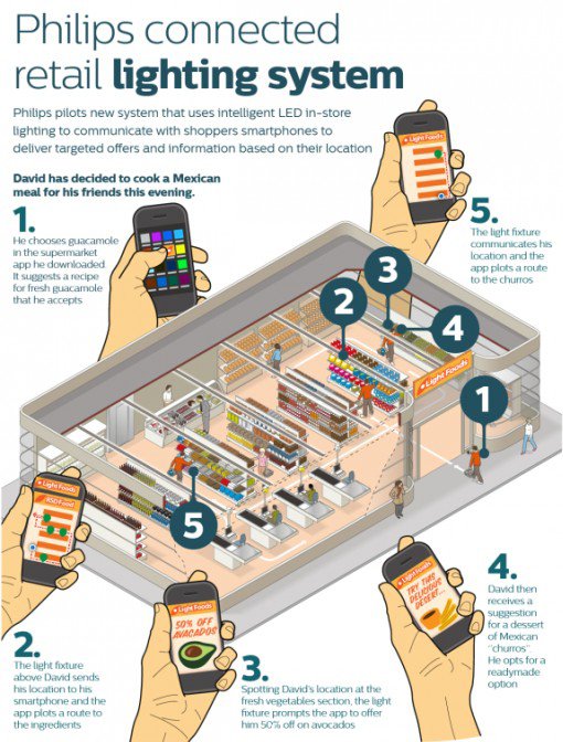 通過將藍(lán)牙通訊功能整合到LED燈具中,飛利浦的“智能燈泡”概念就此走紅。當(dāng)然,智能燈泡不僅能夠運(yùn)用于照明和烘托環(huán)境氛圍,也能夠找到另類(但卻有可能成為主流)的商業(yè)應(yīng)用。在商店和娛樂場所的布置方面,飛利浦也有自己的打算,那就是——通過可與智能手機(jī)溝通的照明系統(tǒng)(藍(lán)牙通訊),實(shí)現(xiàn)基于位置的服務(wù)——如室內(nèi)購物指引和導(dǎo)向等。