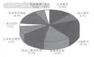 圖1是快速成形技術(shù)的主要應(yīng)用功能的比例。它包括:①直觀展具:用于工程師,設(shè)計師,工具制造者,建筑師,醫(yī)學專家與用戶溝通交流的輔助工具;②展示模型:如地理信息系統(tǒng)模型;③功能模型;④裝配模型;⑤快速模具原型:如硅橡膠模具;⑥金屬鑄造模型;⑦工模具部件;⑧直接數(shù)字/快速制造:如定制化零件,替代物零件等。