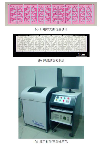 本課題組研制了適合微結(jié)構(gòu)成形的逐層壓印疊加成形裝備,實現(xiàn)了壓印工藝的自動化增量成形,成形平臺達到250 mm?50 mm,定位精度達到0.1 mm。在對肝組織結(jié)構(gòu)分析的基礎(chǔ)上,設(shè)計了人工肝組織支架的仿血管樹[15]和仿肝小葉兩種仿生結(jié)構(gòu)[16],并對其微觀流道結(jié)構(gòu)進行了流體分析,確立了最佳管徑比和最佳夾角。針對仿血管樹支架和仿肝小葉支架j構(gòu),研究并建立了仿生支架壓印卷裹成形和層疊成形工藝方法。最新提出的絲素蛋白/明膠材料的冰模壓印成形方法,消除了支架表面成膜的問題,大大提高了支架微觀結(jié)構(gòu)的連通性,有效促進了細胞的活性和擴增[17](圖10[15])。