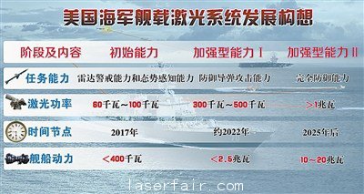 預(yù)計(jì),美海軍的“艦載激光武器系統(tǒng)”將在2017年左右初步形成作戰(zhàn)能力,并且與現(xiàn)有武器配合使用,形成多層次、多功能、多位一體的高效防御武器系統(tǒng),從而描繪出一幅十分誘人的激光武器應(yīng)用前景。