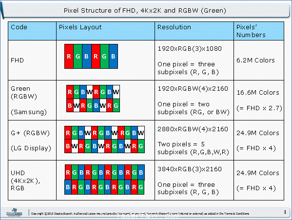 雖然原理相同,但是三星電子和LG Display開(kāi)發(fā)的RGBW 4K面板和傳統(tǒng)4K面板略有不同。除了RGB外,像素中又增加了一種子像素---白色(W)。隨著子像素的增加,RGBW 4K面板也可以達(dá)到更高的分辨率。三星電子將其RGBW面板稱(chēng)為Green UHD,而LG Display則稱(chēng)為G+ UHD。