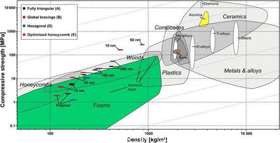 研究人員表示,該材料的穩(wěn)定性/密度比已經(jīng)超過了更巨大的骨頭、鋼鐵、甚至鋁材。未來,這種材料可用于絕緣或微結(jié)構減震器,甚至應用到化學工業(yè)的過濾器中。