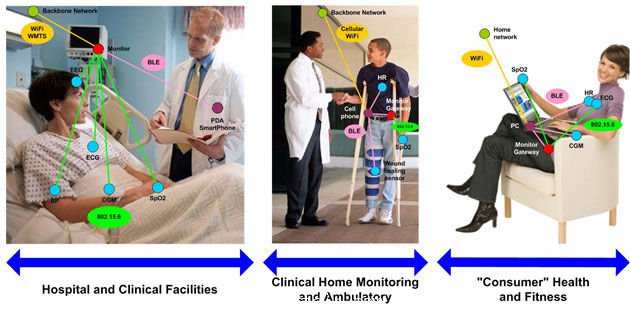 WPAN占有個人周圍的網絡空間,覆蓋了附近的生活或工作空間( 通??蛇_十米),并采用藍牙和Zigbee等協(xié)議來實施。WBAN則占有更小的無線空間,在人體周圍大約一米,用于與人體相關的傳感器通信。應用已從大量的工作周期性點測擴展到更多數(shù)據(jù)密集的連續(xù)鏈接。在醫(yī)院和臨床設施、臨床家庭監(jiān)護和非臥床應用、以及消費者健康和健身中,這項技術有著多種應用(參見圖5)。