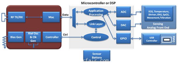 小心平衡這些取舍的一個示例就是美高森美的ZL70250收發(fā)器(參見圖7),該器件在尺寸大約2mm x 3mm的芯片級封裝內,具有標準的2線和SPI接口,可使用任何標準微控制器進行控制和數(shù)據(jù)傳送。該微控制器的模數(shù)轉換器(ADC)連接至超低功耗模擬前端器件,連同ZL70250收發(fā)器,所構成的解決方案可用于開發(fā)無線ECG解決方案,采用CR系列紐扣電池可以連續(xù)運行長達一周時間。此類器件,比如用于病患呼吸測量的3軸加速計或脈搏血氧計(pulse-oximeter)、以及各種其它可穿戴式健康監(jiān)控平臺,都可以達到類似的功率效率。此類器件使低成本紐扣電池或小型鋰離子電池在更換前能夠支持長達兩周時間的連續(xù)WPAN和WBAN數(shù)據(jù)流。