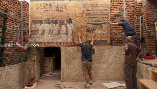豎起墻繪壁板。壁板上面覆蓋上使用3D技術(shù)激光掃描儀掃描的原壁畫圖片。