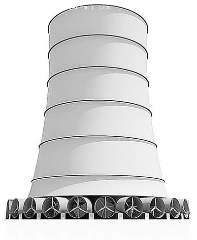 這座塔位于炎熱干燥的地區(qū)。其結(jié)構(gòu)是一個聳入云端的中空圓柱體,頂部開口以便驕陽炙烤過的干熱空氣進入。旁邊設(shè)有噴水系統(tǒng),可將水泵提送上來的水形成水霧噴灑到塔頂?shù)拈_放區(qū)域。當(dāng)水分遇上干燥的空氣之后蒸發(fā),空氣迅速變冷,比重增加,由此形成垂直下沉的氣流,速度可達約50英里/小時。