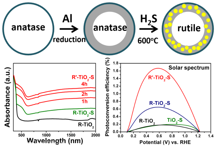 黑色硫摻雜金紅石相二氧化鈦制備示意圖、吸收光譜和光電轉(zhuǎn)換(JACS 2013)
