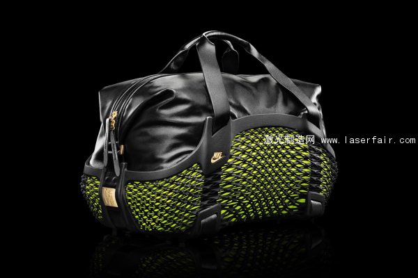 每個Rebento Duffel運(yùn)動包都嵌著3D打印的帶有使用者名字的金色配飾。包包的底部仿效了耐克新出的Magista和Mercurial運(yùn)動鞋的釘板鞋底風(fēng)格。運(yùn)動包的下半部分的設(shè)計也參考了耐克最新的旗艦技術(shù)Flyknit,形成類似織網(wǎng)的效果。而這種相互交織的編織效果是用一種柔韌的3D打印材料——尼龍——3D打印而成。耐克在這里使用了選擇性激光燒結(jié)(SLS)技術(shù)。