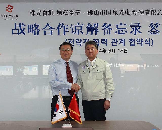 18日,韓國培耘電子公司與中國佛山市國星光電股份有限公司簽訂《戰(zhàn)略合作諒解備忘錄》,將在LED照明戰(zhàn)略技術(shù)方面進(jìn)行合作。圖為培耘電子公司代表理事安槿駿(右)與佛山...