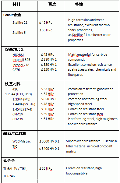 目前,利用激光熔覆技術(shù)可以制備鐵基、鎳基、鈷基、鋁基、鈦基、鎂基等金屬基復(fù)合材料。從功能上分類:可以制備單一或同時(shí)兼?zhèn)涠喾N功能的涂層如:耐磨損、耐腐蝕、耐高溫等以及特殊的功能性涂層。從構(gòu)成涂層的材料體系看,從二元合金體系發(fā)展到多元體系。多元體系的合金成分設(shè)計(jì)以及多功能性是今后激光熔覆制備新材料的重要發(fā)展方向。常見(jiàn)的激光熔覆材料見(jiàn)下表: