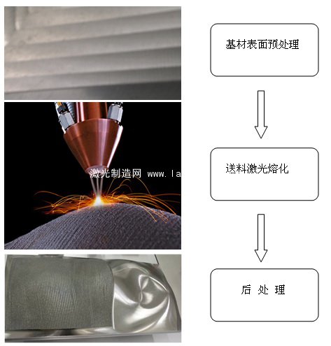 同步送粉式激光熔覆的主要工藝流程為:基材表面預(yù)處理---送料激光熔化---后處理,如下圖示: