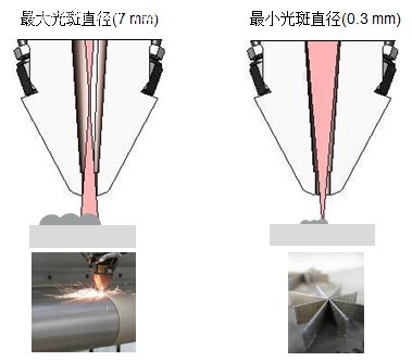 通快提供承受最大4KW激光的同軸送粉頭和承受10KW激光的旁軸送粉頭。值得一提的是通快提供的融覆加工頭具有光斑直徑能夠在0.3mm ~7mm實(shí)時(shí)可調(diào)功能。這樣進(jìn)行加工時(shí)就能通過(guò)編程調(diào)節(jié)激光光斑直徑,既能保證激光熔覆很高的加工精度,又能保證很高的融覆效率。