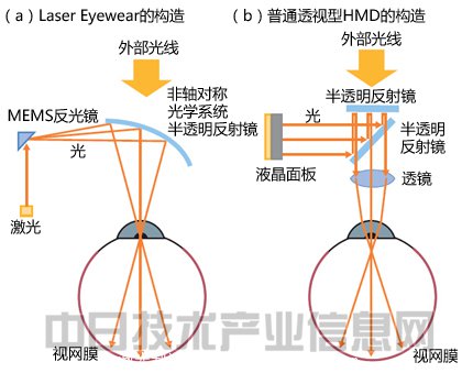 圖1 QDLaser公司開發(fā)的可使光線高效到達視網(wǎng)膜的“Laser Eyewear”,因為直接向視網(wǎng)膜照射激光,所以具有近視眼等也能高效而清晰地看到影像的優(yōu)點。而且,光學系統(tǒng)非常簡單。如果是使用液晶面板的HMD,液晶面板等會導致入射的光線減弱,因此原理上效率低于Laser Eyewear。另外,光學系統(tǒng)也比較復雜。