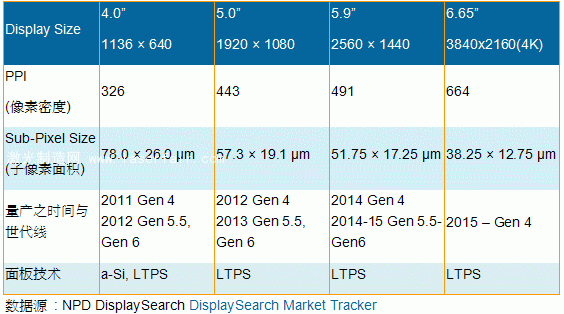 NPD DisplaySearch 觀察到, 目前雖然4K 電視隨處可見, 但以智能手機(jī)與智能平板等移動(dòng)裝置面板而言, 要達(dá)到超高分辨率與絕對(duì)分辨率相比,像素密度(Pixel Per Inch, PPI)為面板制造帶來(lái)的困難更多。