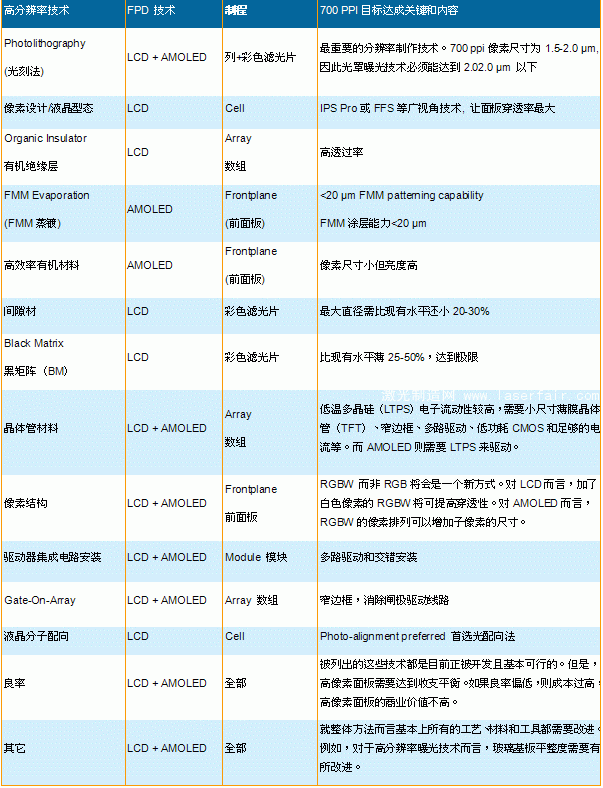 一個(gè)6吋4K等級(jí)的智能手機(jī)面板已經(jīng)高達(dá)734 ppi, 就高達(dá)734 ppi的分辨率而言,其關(guān)鍵的像素設(shè)計(jì)尺寸已經(jīng)比先進(jìn)的半導(dǎo)體組件還精細(xì),然而大多數(shù)面板設(shè)備和材料的設(shè)計(jì)原則都相對(duì)較為寬松。因此通常無(wú)法應(yīng)付這種精細(xì)度逼近半導(dǎo)體極限的制造。另外,F(xiàn)PD面板由大尺寸、薄玻璃片組成,再通過(guò)加工精度權(quán)衡FPD面板尺寸和維持工廠產(chǎn)能。因此,牽一發(fā)動(dòng)全身, 要提高分辨率, NPD DisplaySearch 認(rèn)為需要整體加強(qiáng)以下表格中各種不同的技術(shù)。