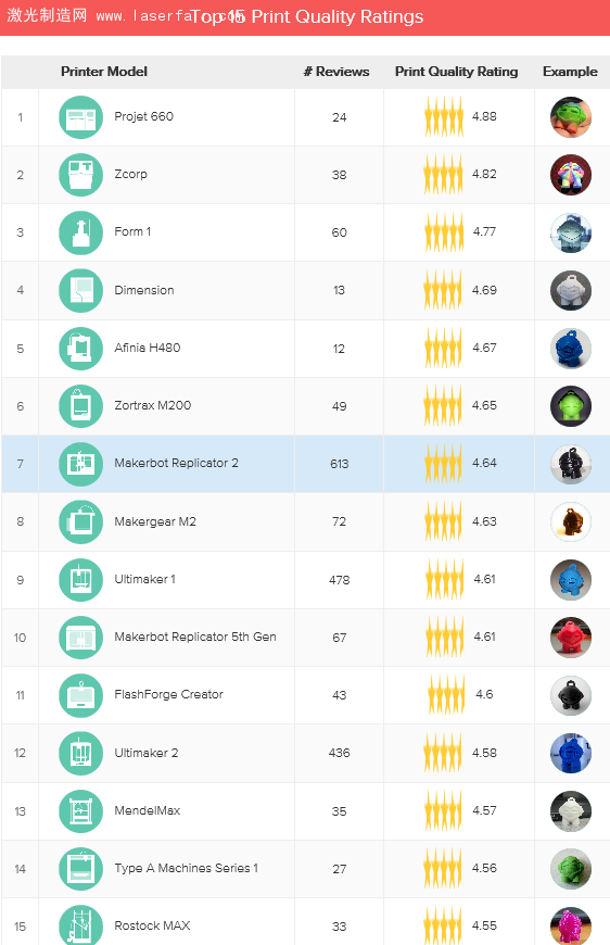 該報告列出了8月份打印質(zhì)量評價最高的前15款3D打印機(jī)。其中兩款專業(yè)級的3D打印機(jī),即3D Systems公司的Projet 660、Zcorp分列前兩名。上個月排名第一的Form1 SLA 3D打印機(jī),本月下滑兩位,列第三。Afinia H480本月頭次上榜即名列5位,讓人印象深刻。需要指出的是,Afinia為我國3D打印機(jī)廠商北京太爾時代在美國的貼牌產(chǎn)品。
