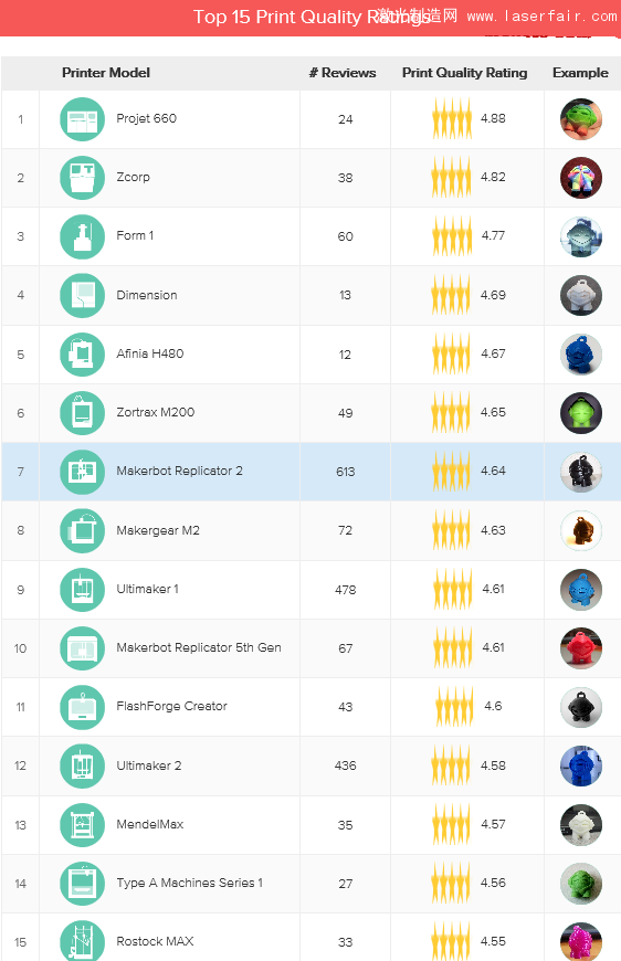該報告列出了8月份打印質(zhì)量評價最高的前15款3D打印機。其中兩款專業(yè)級的3D打印機,即3D Systems公司的Projet 660、Zcorp分列前兩名。上個月排名第一的Form1 SLA 3D打印機,本月下滑兩位,列第三。Afinia H480本月頭次上榜即名列5位,讓人印象深刻。需要指出的是,Afinia為我國3D打印機廠商北京太爾時代在美國的貼牌產(chǎn)品。