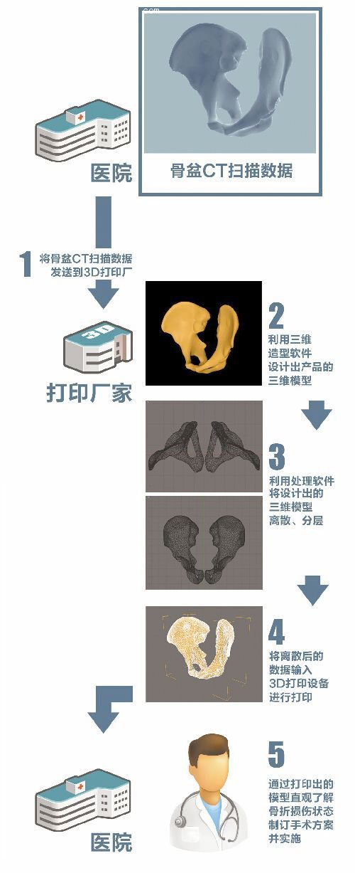 為小軍3D打印骨盆的深圳某公司負(fù)責(zé)人袁曉茂告訴記者,院方將小軍的CT影像數(shù)據(jù)在沒有被壓縮和損傷,且保證完整的情況下,發(fā)送給公司,公司由專門的工程師進(jìn)行數(shù)據(jù)處理,處理數(shù)據(jù)的過程可能需要十多個小時,甚至二十個小時,然后將處理出來的數(shù)據(jù)輸入電腦內(nèi),再進(jìn)行打印,模型最后在打印機中成型“出爐”。整個過程需要三天左右。模型越大,處理起來的時間將會越長。不過該公司并未透露材質(zhì)是什么。