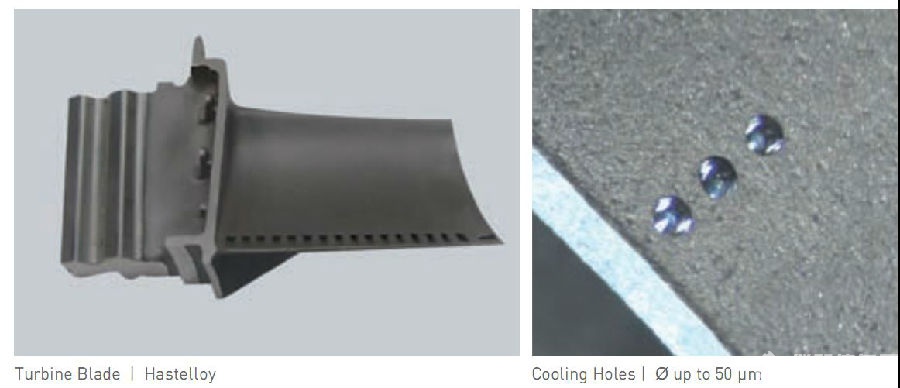 航空應用:渦輪葉片鉆孔,發(fā)動機部件,制冷孔,氣膜孔打孔