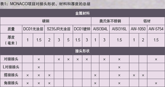 這個(gè)項(xiàng)目對(duì)使用碟片激光進(jìn)行焊接的幾種形狀的接頭(對(duì)接接頭、搭接接頭和角接接頭,見圖3)以及幾種金屬材料和不同厚度的組合(目前制造業(yè)中最常見的組合)進(jìn)行了評(píng)估,并且與鎢極氣體保護(hù)電弧焊(GTAW)進(jìn)行了比較,見表1。