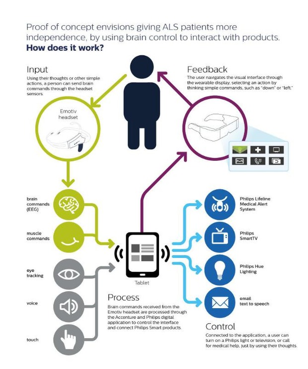 飛利浦(Philips)和Accenture兩公司近日宣布,開(kāi)發(fā)出了將可測(cè)量腦波的設(shè)備和可穿戴顯示器連接在一起的概念驗(yàn)證用軟件(英文相關(guān)資料)。有望應(yīng)用于協(xié)助肌萎縮側(cè)索硬化癥(ALS)等神經(jīng)退化類(lèi)疾病患者的自立等用途。