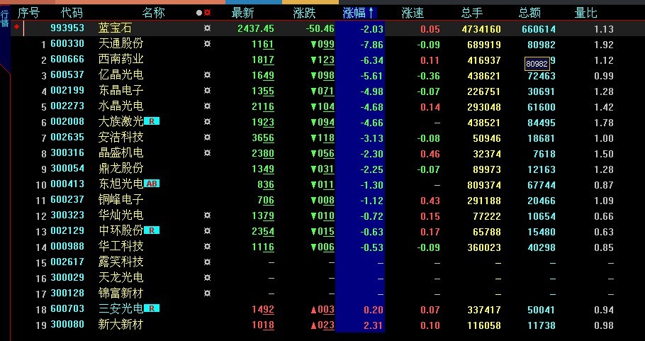 受到這個消息的影響,GTAT股價當(dāng)日跌12.89%。蘋果股價在發(fā)布會當(dāng)日也猶如過山車,最終收低0.37%。今日國內(nèi)藍(lán)寶石概念相關(guān)個股可謂全線慘綠。截至收盤,天通股份領(lǐng)跌幅之最,跌幅7.86%,剛因為收購奧瑞德光電晉升為藍(lán)寶石概念股的西南藥業(yè)下跌6.34%,億晶光電下跌5.61%,東晶電子下跌4.98%,水晶光電下跌4.68%,而露笑科技正處在停牌中(詳見下圖)。
