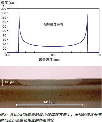 對(duì)輪廓焊接和準(zhǔn)同步焊接來(lái)說(shuō), M形光斑強(qiáng)度的分布更為方便。顧名思義,M形強(qiáng)度分布的圓形平頂光束成像在工件上的光斑在邊緣的強(qiáng)度要高于中間位置。這就能確保焊接過(guò)程中沿著焊縫方向的溫度分布均勻。圖2顯示了含有0.5wt%碳黑的聚丙烯中的M形強(qiáng)度分布的光斑和相應(yīng)的熱影響區(qū)。這里的透熱深度是指沿著光束引導(dǎo)方向上的透熱深度。