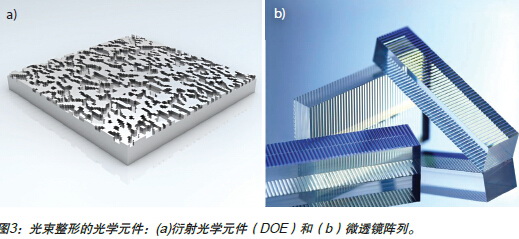 在衍射方法中, 衍射光學(xué)元件(DOE)定位在準(zhǔn)直激光束的傳播路徑上。衍射光學(xué)元件表面的極小的結(jié)構(gòu)能按照預(yù)想的形狀和強(qiáng)度設(shè)置來(lái)衍射激光光束(圖3)。衍射方法的優(yōu)點(diǎn)在于可以修改激光光斑的大小和強(qiáng)度。此外,衍射光學(xué)元件不需光學(xué)對(duì)準(zhǔn)。因此,可以容易、快速地通過(guò)更換衍射光學(xué)元件來(lái)改變焊縫寬度,而無(wú)需更改任何透鏡和工作距離。衍射技術(shù)的缺點(diǎn)是相比折射方法具有較高的光損耗,并且根據(jù)不同的要求,需要更高亮度的激光源——光纖激光器。