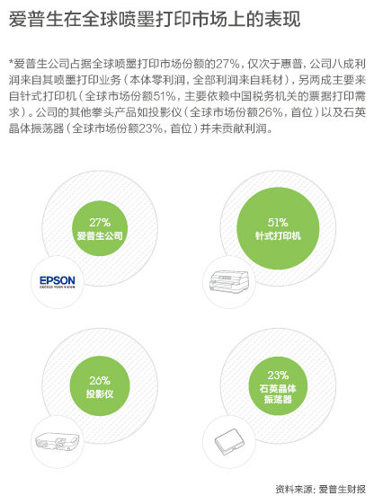 來自IDC的數(shù)據(jù)證明了他的決意。愛普生將重心放在噴墨上,而且嚴(yán)重依賴噴墨耗材帶來的收益。這家公司占據(jù)全球噴墨打印機(jī)市場(chǎng)份額的27%,僅次于惠普。公司也有八成利潤來源于噴墨打印生意,而占據(jù)全球份額首位的投影儀和石英晶體振蕩器并未貢獻(xiàn)利潤。