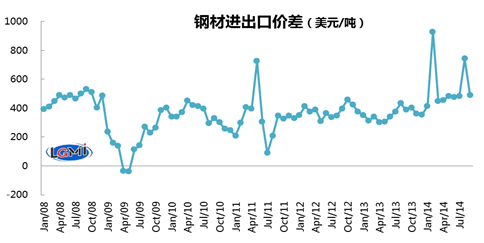 另一方面,9月份我國進(jìn)口鋼材平均價格1228美元,較去年同期上漲11美元,單月鋼材進(jìn)、出口價差高達(dá)489美元(除2014年2月、8月以外最高)。從累計情況看,今年前三季度,我國進(jìn)口鋼材累計平均價格1246美元,鋼材進(jìn)、出口價格為463.5美元,價差連續(xù)9個月呈擴(kuò)大趨勢。