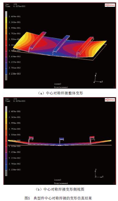 激光焊接機(jī)身壁板對比傳統(tǒng)的鉚接機(jī)身壁板而言,具有明顯的減重效果,能改善連接部位的性能,同時(shí)具有降低制造成本、提高生產(chǎn)效率等多方面的優(yōu)點(diǎn)。但是,激光焊接造成的應(yīng)力集中和變形問題,卻是鉚接過程所不存在的。大型客機(jī)機(jī)身壁板激光焊接工藝屬于大尺寸、小厚度、多焊縫的復(fù)雜焊接工藝,其變形過程甚為復(fù)雜。圖5為壁板典型件焊接變形模擬結(jié)果,是針對大型客機(jī)壁板典型件(3根桁條)開展熱力耦合分析的結(jié)果。如圖5所示,即使采用較優(yōu)的中心對稱焊接技術(shù)(焊接方向相同,順序?yàn)橄戎虚g后兩邊),仍然具有較大的變形量。試驗(yàn)研究也已表明,對于多桁條構(gòu)件,其變形機(jī)理復(fù)雜。