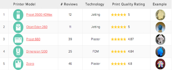 工業(yè)級3D打印機(jī)的評級榜上,Pojet 3500 HDMax、Objet Eden 260并列第一,并獲得滿分5星。在這里,SLS和噴射技術(shù)占據(jù)上風(fēng),而具有全彩打印能力的 Project 660和Zcorp分別獲得了第3和第5名。Dimension 1200是名單上唯一的FDM打印機(jī),第4位。