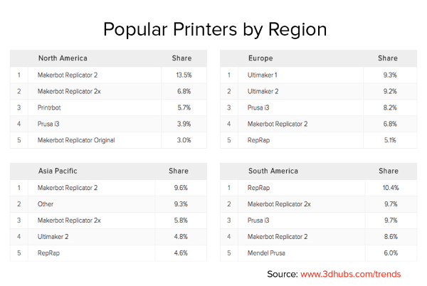 此外,3D Hub還按區(qū)域?qū)τ谝恍?D打印機(jī)品牌的市場占有率進(jìn)行了統(tǒng)計(jì)。這個數(shù)據(jù)沒有太大的改變:在歐洲,前兩名的是Ultimaker 1和2。同樣,在北美、亞太Markerbot Replicator 2和2X也高居榜首。