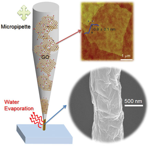GO納米線的制造通過拉動一個(gè)含有GO懸浮浮液的微量吸管(GO板厚度為0.9±0.1納米),以及在水蒸發(fā)過程中拉伸該彎液面來實(shí)現(xiàn)。 在上圖圈中(右下):FE-SEM圖像顯示出一個(gè)生長成的rGo納米線,直徑為400納米。via Nanowerk & Advanced Materials