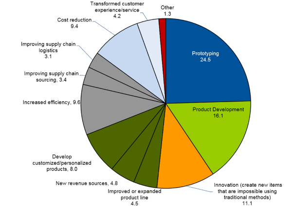 調(diào)查結(jié)果還顯示,雖然原型設(shè)計、產(chǎn)品的創(chuàng)新和開發(fā)是3D打印技術(shù)的主要應(yīng)用領(lǐng)域,但該技術(shù)也被廣泛用于制造方面的應(yīng)用(見下圖)。