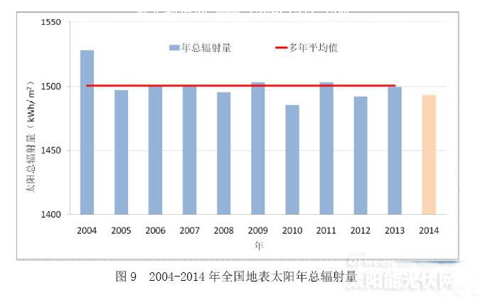 2014年,全國陸地表面平均的水平面總輻射年輻照量為1492.6kWh/m2,較近10年(2004-2013年)平均值偏少8.1kWh/m2(圖9),為近10年來次小值年。