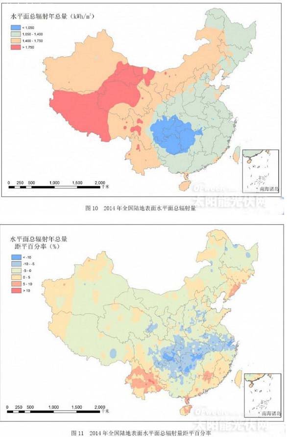 通過中國氣象局對我國太陽能利用2004-2014年逐年全國氣象臺站總輻射和日照觀測資料,經(jīng)統(tǒng)計分析和插值處理,得到全國陸地2.5°╳2.5°的格點要素資料,用于評估2014年太陽能資源參數(shù)的年景特征。