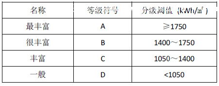2014年,我國太陽能資源最豐富區(qū)包括青海大部、西藏中西部、甘肅西部、內(nèi)蒙古西部,新疆東部及四川西部部分地區(qū),年總輻射量超過1750kWh/m2,等級為A;華北北部、新疆大部、甘肅中東部大部、寧夏、陜西北部、青海南部和東部、西藏東部、四川西部、云南大部及海南等地為1400~1750kWh/m2,為太陽能資源很豐富區(qū),等級為B;東北大部、華北南部、黃淮、江淮、江漢、江南及華南大部為1050~1400kWh/m2,為太陽能資源豐富區(qū),等級為C,四川東部、重慶、貴州中東部、湖南中西部、湖北西部地區(qū)不足1050kWh/m2,為太陽能資源一般區(qū),等級為D。