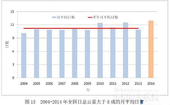 在新疆和西藏等地區(qū)偏大、在中國東北至長江中下游地區(qū)偏小的主要原因。2014年,全國大部分地區(qū)云量增多,總云量大于8成的月平均日數(shù)增多,是近10年來的最大值(圖15),這是導(dǎo)致到達地表的太陽總輻射量減少重要原因之一。