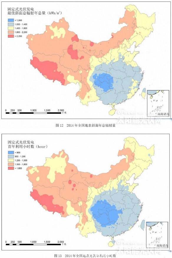 全國最佳斜面總輻射及光伏發(fā)電年利用小時數(shù)空間分布顯示(圖12、圖13),2014年,我國東北、華北、西北及西南大部最佳斜面總輻射年總量超過1400kWh/m2,年利用小時數(shù)在1100小時以上,其中新疆大部、青藏高原、甘肅西部、內(nèi)蒙古、四川西部及云南部分地區(qū),最佳斜面總輻射年總量超過1800kWh/m2,年利用小時數(shù)在1500小時以上,局部超過1800小時;四川東部、重慶、貴州中東部、湖南中西部及湖北西部地區(qū),最佳斜面總輻射年總量小于1000kWh/m2,年利用小時數(shù)不足800小時;其余地區(qū)最佳斜面總輻射年總量在1000~1400kWh/m2之間,年利用小時數(shù)在800~1100小時之間。