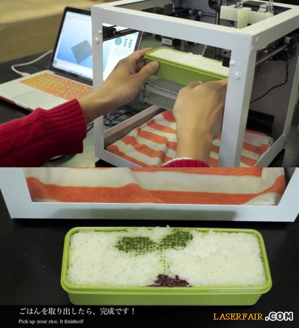 近日,日本慶應(yīng)義塾(Keio)大學(xué)的學(xué)生Yoshihiro Asano對(duì)一臺(tái)普通的Solidoodle 3D打印機(jī)進(jìn)行了改裝,將其變成了一臺(tái)特殊的食品打印機(jī)Lunchbot,這臺(tái)Lunchbot不能干別的,只能使用各種調(diào)料裝飾您的便當(dāng)盒,在米飯上繪出各種有趣的圖案。
