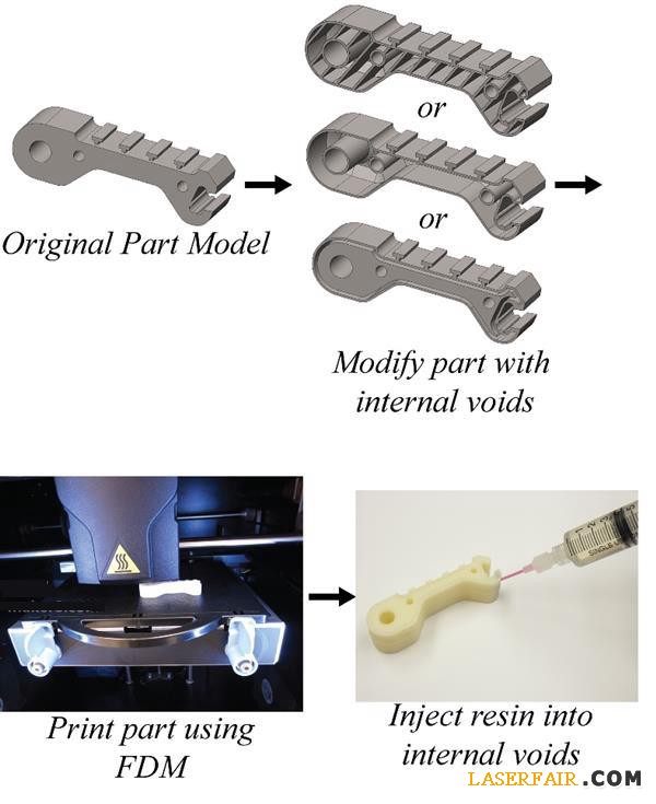 兩位科學(xué)家在論文稱,這種方法相當(dāng)簡(jiǎn)單。“通過在打印部件中仔細(xì)放置空隙,并用高強(qiáng)度的樹脂填充它們,我們可以將零部件整體的強(qiáng)度和剛度分別提升45%和25%。”他們寫到。“該方法保留了3D打印快速和容易構(gòu)造的好處和制造復(fù)雜幾何形狀的能力。”
