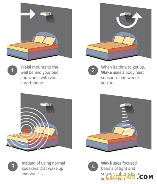 當(dāng)起床的時(shí)間到,“Wakē”鬧鐘會(huì)開(kāi)始轉(zhuǎn)動(dòng)并且鎖定要起床的人,向他照射LED光線(xiàn),此LED光線(xiàn)由弱轉(zhuǎn)強(qiáng),模擬太陽(yáng)升起的狀況,讓使用者產(chǎn)生自然起床的生理反應(yīng)。若用戶(hù)還是沒(méi)有起床,鬧鐘就會(huì)進(jìn)行下一步“叫”你起床。它的原理是使用超指向性揚(yáng)聲器(parametric speaker),可針對(duì)一個(gè)方向發(fā)射超音波,讓指定的人聽(tīng)見(jiàn)且不會(huì)吵醒他人。