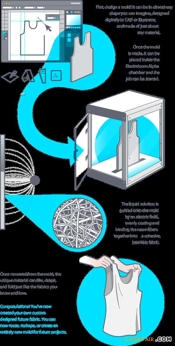Electroloom從某種程度上有一些常規(guī)3D打印機的影子,但是其功能和技術(shù)原理完全不同。據(jù)了解,Electroloom的構(gòu)建室里能夠產(chǎn)生一種電場,該機器就靠這種電場來引導(dǎo)一種特殊的液態(tài)納米纖維溶液。