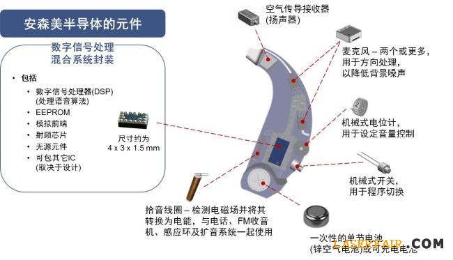 圖3:展示一個(gè)典型的助聽(tīng)器的組成及安森美半導(dǎo)體可提供的元件