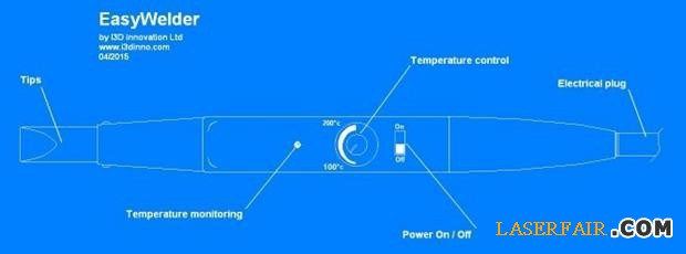 為了讓使用者把不同的線材連接/焊接在一起,EasyWelder上設(shè)計(jì)了一個(gè)像老虎鉗虎口那樣的一個(gè)部件,可以把兩段線材緊緊壓在一起,該部件同時(shí)可以通電加熱,使線材受熱熔化并連在一起。這個(gè)EasyWelder的工作溫度可達(dá)到100°至200°C,在具體操作中,為了防止線材與EasyWelder的熱鐵粘在一起,還需要在線材外面包上一層抗粘接的材料。