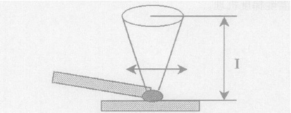 在車(chē)頂?shù)臋C(jī)器人編程及焊接實(shí)踐中,關(guān)鍵在與確定焦點(diǎn)的大小和相對(duì)位置。如圖4所示,錐形體代表入射激光,斑點(diǎn)代表落在焊縫表面的激光焦點(diǎn),兩個(gè)搭接的陰影塊分別代表待焊的車(chē)頂和側(cè)圍零件。調(diào)整聚焦鏡組與焊縫上下的距離L就可以改變焦點(diǎn)的大小,調(diào)整左右的距離便可確定焦點(diǎn)相對(duì)于車(chē)頂和側(cè)框的位置。