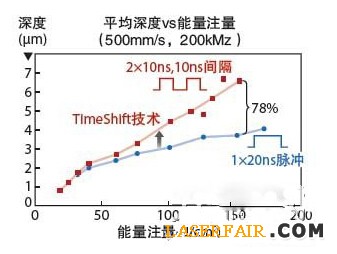 圖3:氧化鋁的刻劃深度vs能量注量曲線,顯示了TimeShift技術(shù)對(duì)生產(chǎn)率的影響。